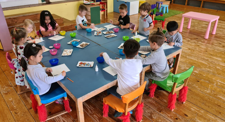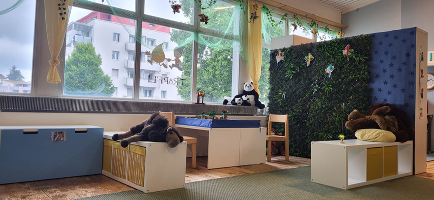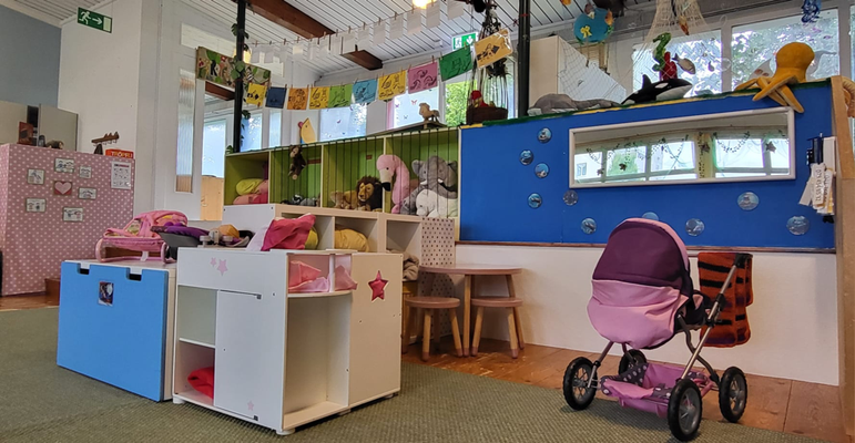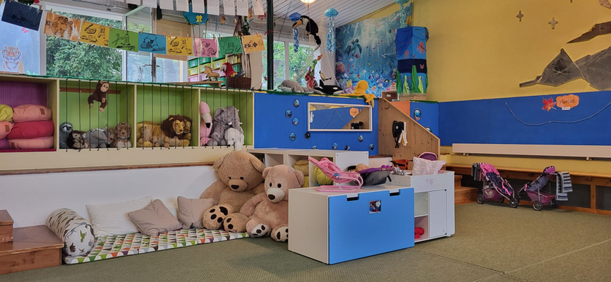Der hohe, helle und grosszügige Raum lädt ein zum Spielen, Singen, Basteln, für Rollenspiele, Malen, Kneten, Geschichten hören und vieles mehr.